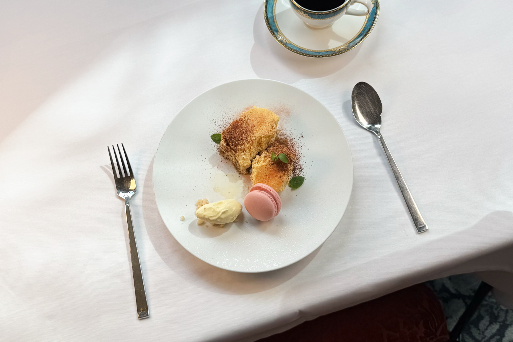 添えるのは、しっかりとした歯応えが心地いいベリーのマカロン。ひと口で広がるフルーティーな香りが、ティラミスの余韻をさらに澄ませてくれるようで、食後の時間が少しだけ特別に整っていきます。