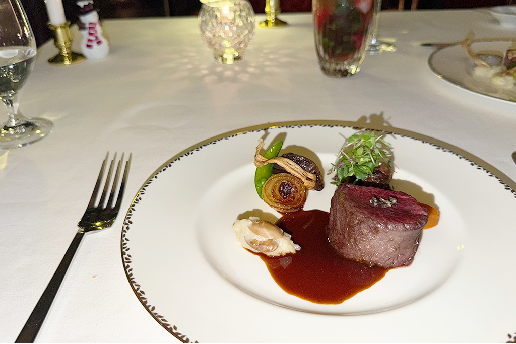 京人参とマッシュルームの2種のピュレが味に奥行きを与え、ソースは鹿の出汁に赤ワインとすぐりを合わせた“グランヴヌール”。